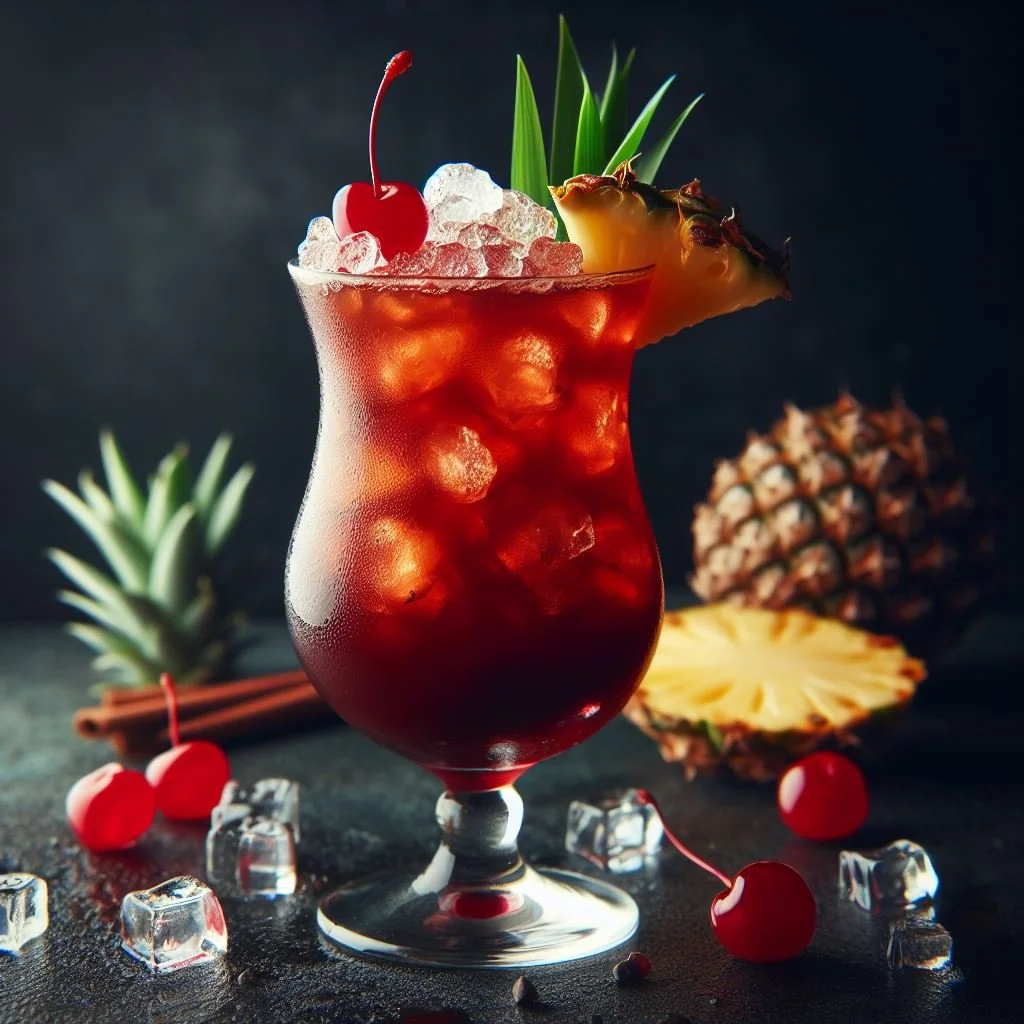 Combine ingredients in cocktail shaker with ice. Shake and strain into crushed ice filled hurricane glass. Garnish with cherry and pineapple wedge.