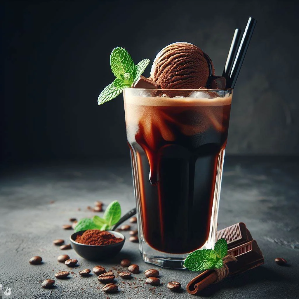 Add coffee, crème de menthe, and crème de cacao in cocktail shaker with ice. Shake and strain into highball glass. Add scoop of chocolate ice cream. Add straw and mint leaves for garnish.