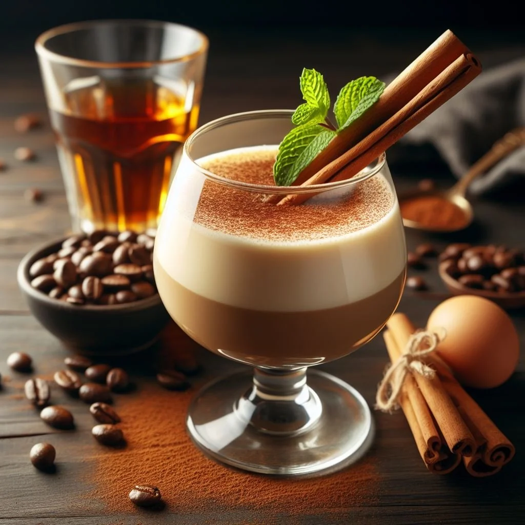 Shake ingredients together with ice and strain into snifter. Garnish with ground nutmeg and cinnamon. Add cinnamon stick and mint leaves.