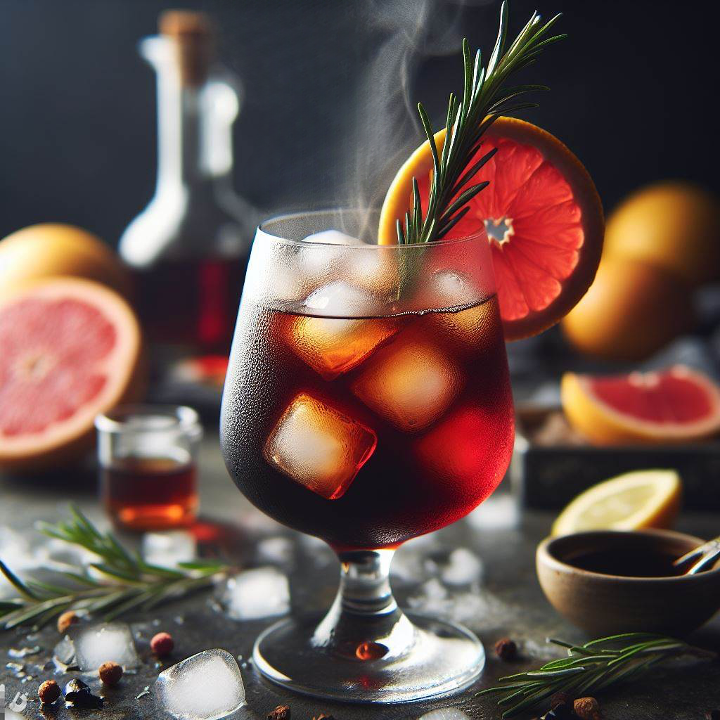 Pour coffee, fortified wine, grapefruit juice, and maple syrup into cocktail shaker with ice. Shake and strain into ice filled white wine glass. Garnish with sprig of burnt rosemary pierced into lemon peel.