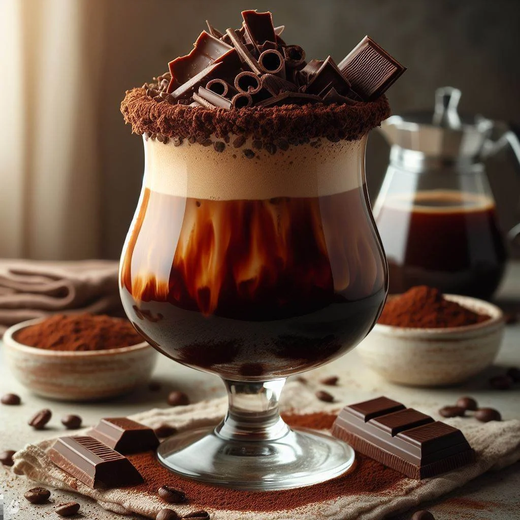 Blend coffee, Tennessee whiskey, coffee liqueur, and ice cream in blender. Pour into ground coffee rimmed hurricane glass and top with chocolate shavings.