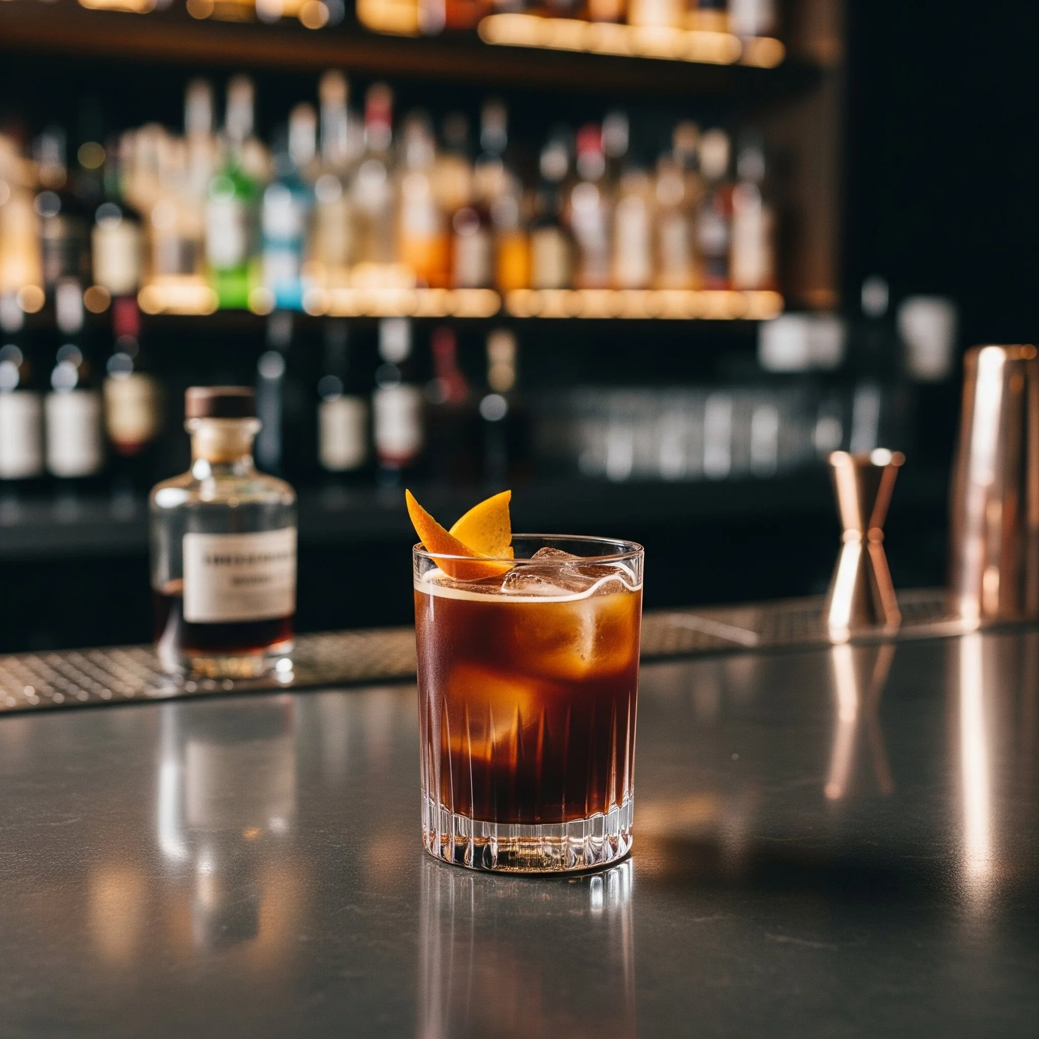 Pour ingredients into Highball glass with ice. Stir and add an orange peel garnish.